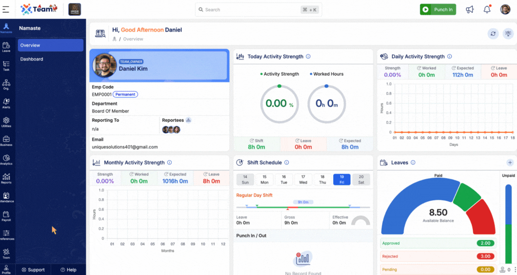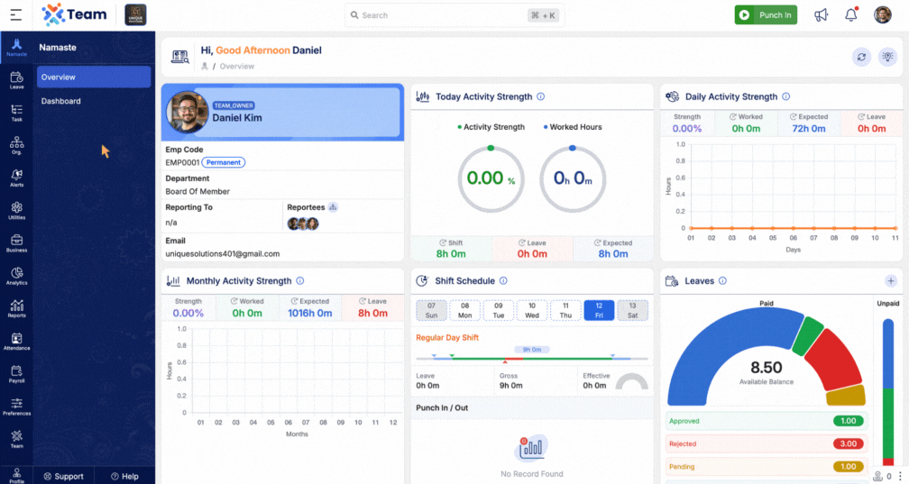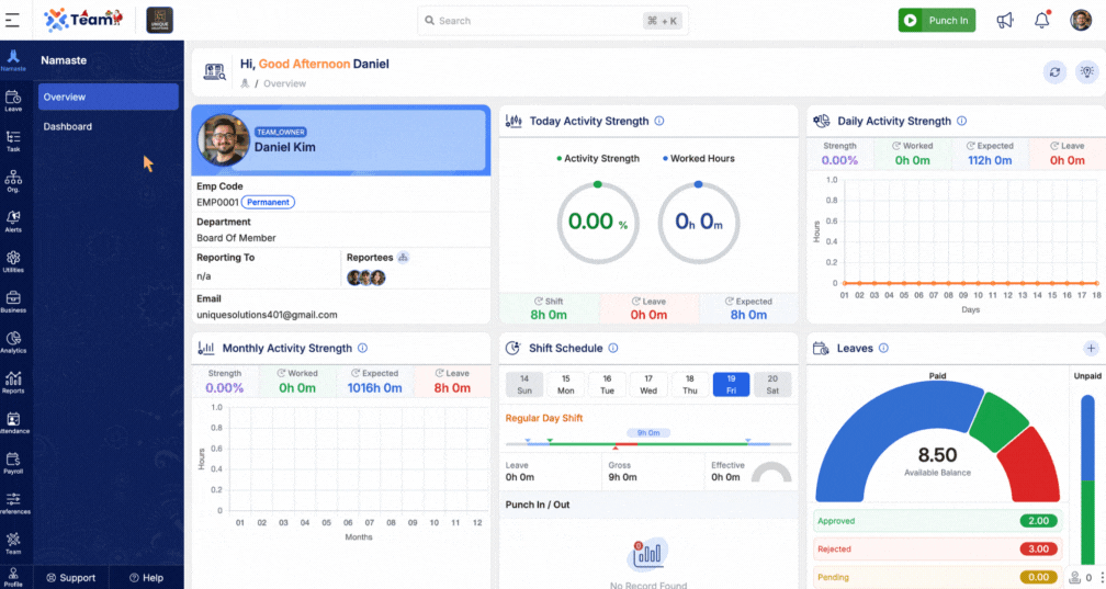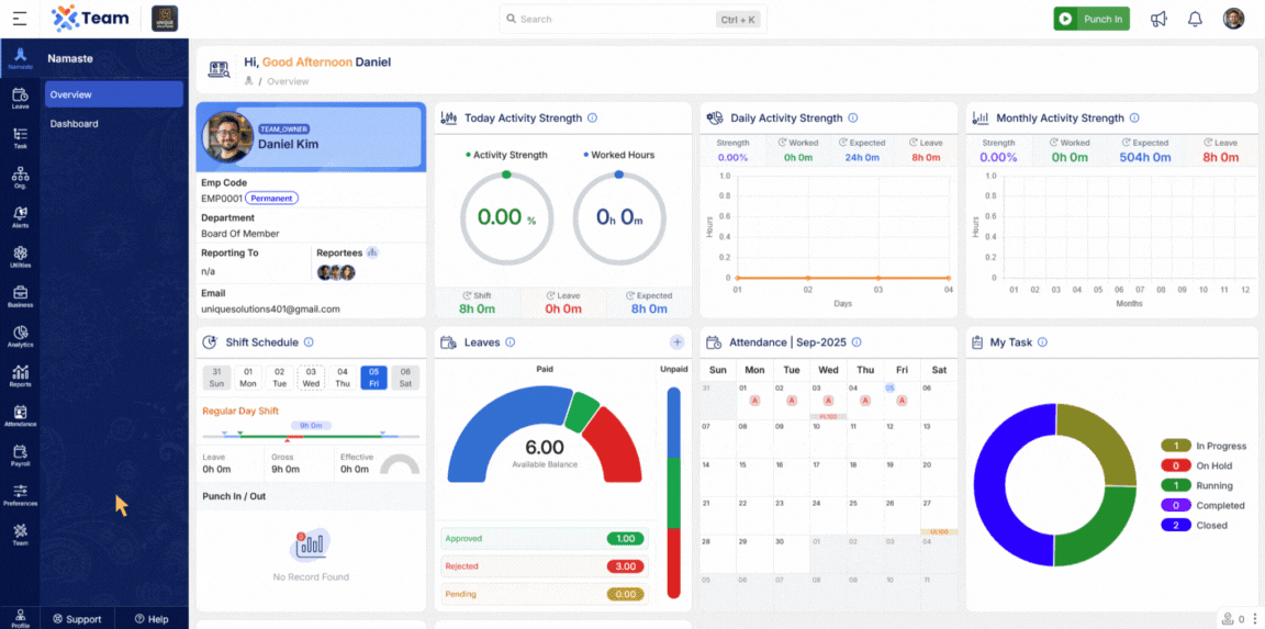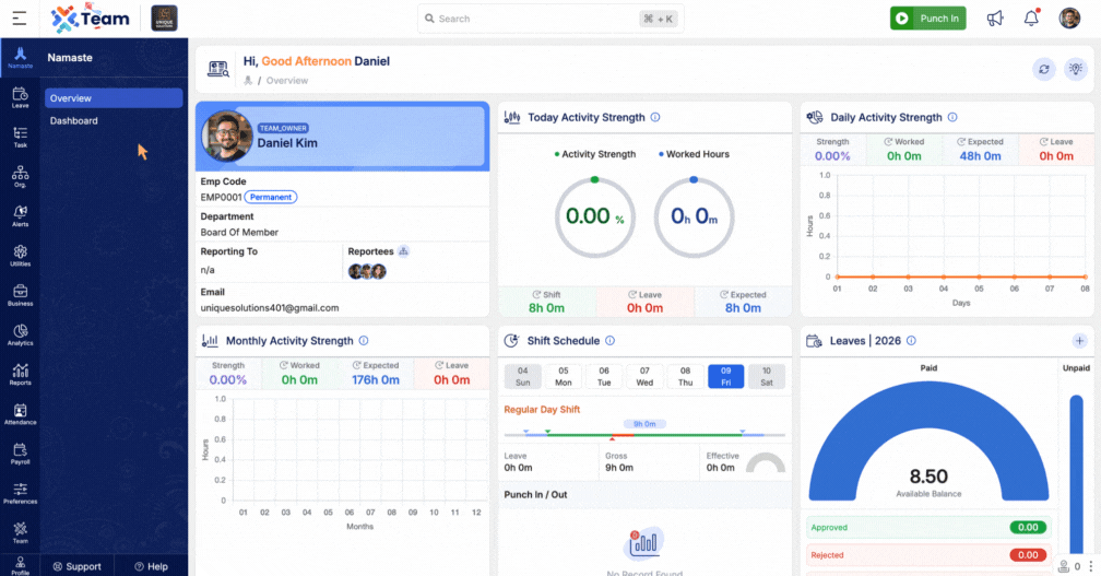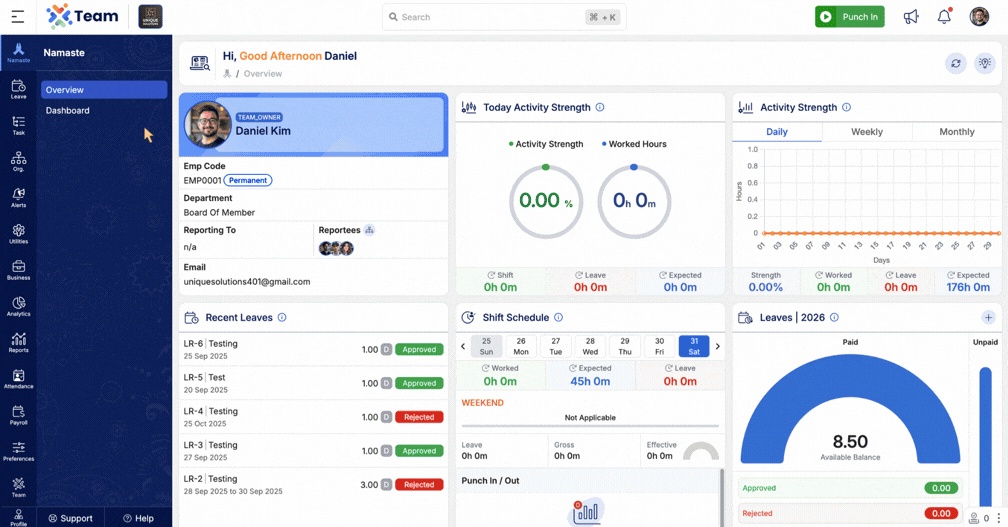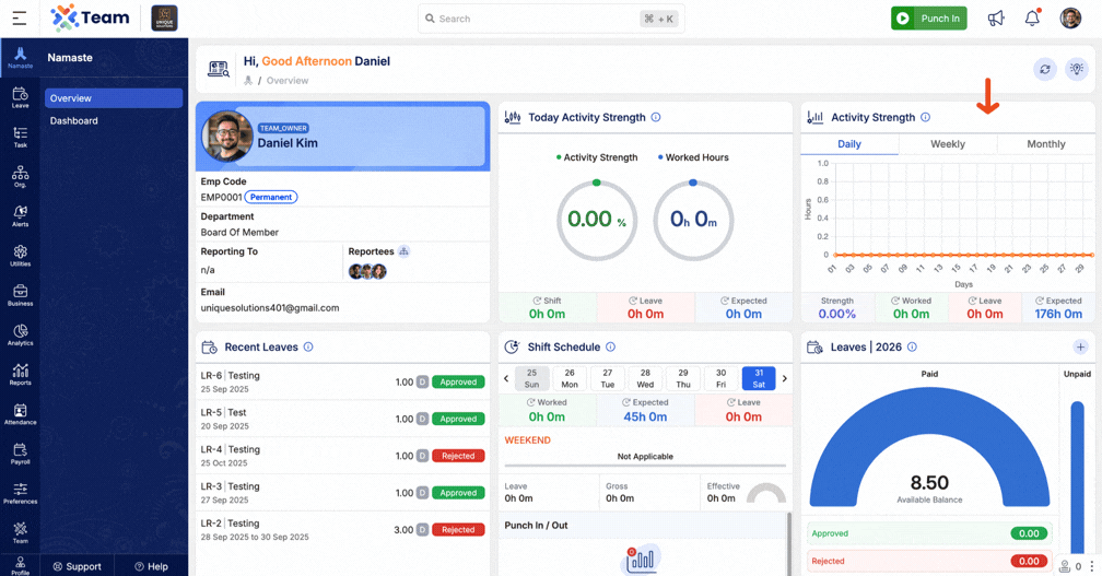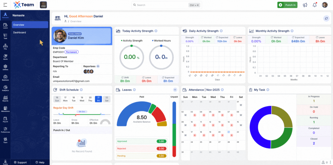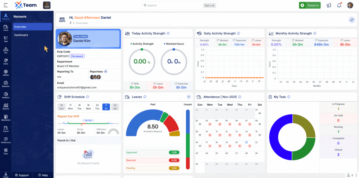 We’ve added a Shift Board under the Attendance section. This allows users to view their own or other employees’ assigned shifts in a day-wise calendar format. It enhances visibility into work schedules and simplifies shift planning.